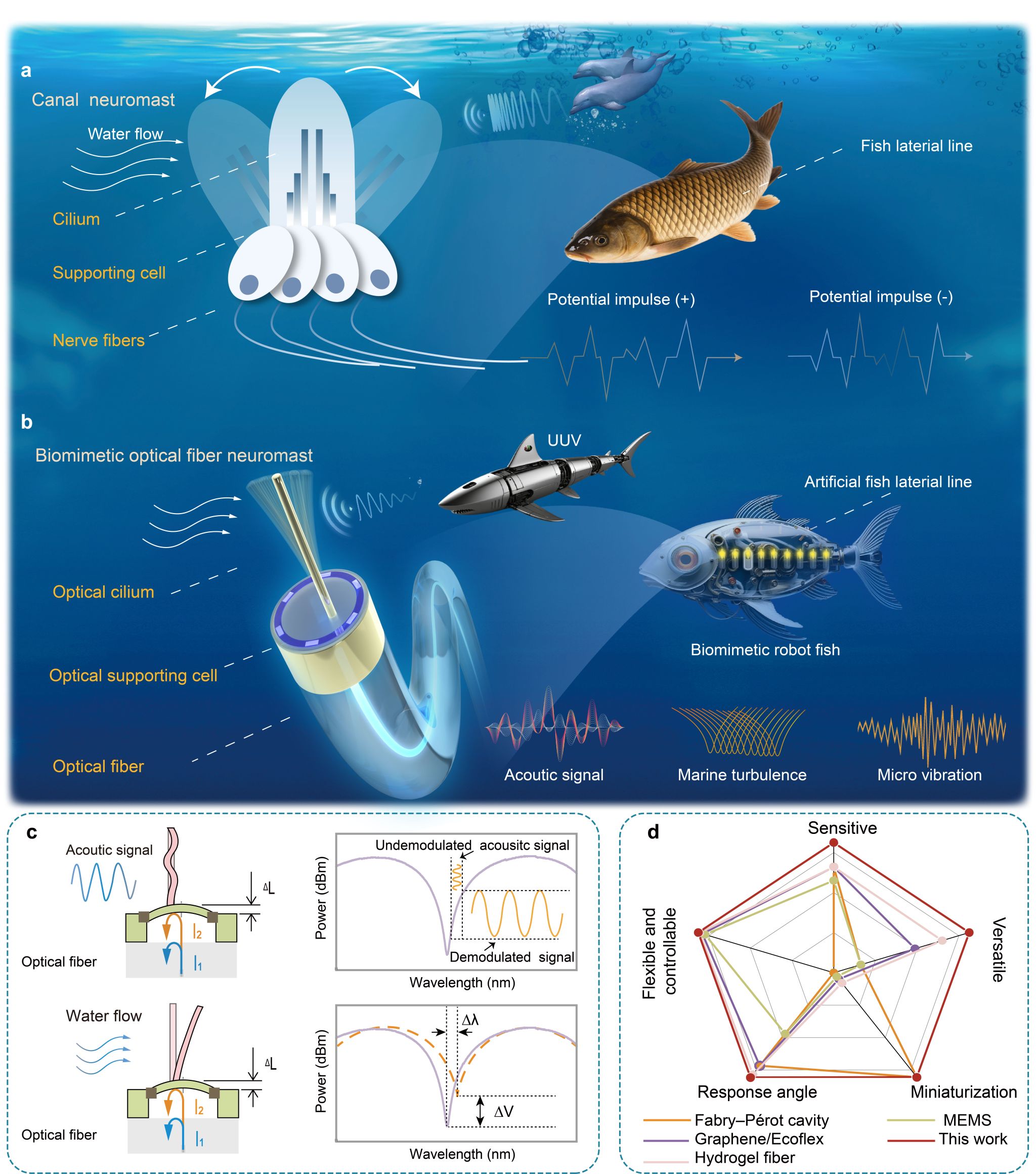 水下声学、振动及流体信号的高灵敏探测对海洋资源勘探、生态监测和国防安全具有重要意义。水中的鱼类能在复杂水环境中游刃有余,其秘密武器是遍布体侧的“侧线系统”。侧线管道内分布着鱼类感觉单元——神经丘(Neuromast)。这个仅细胞大小的精巧结构,包含感受纤毛、支撑细胞和神经纤维。水下机械信号作用于凝胶顶结构,随即纤毛偏转引发电位变化,该电位信号通过神经纤维直达“大脑”。这种集成设计让鱼类拥有了对声音、振动和水流的高灵敏度、全方位感知能力。