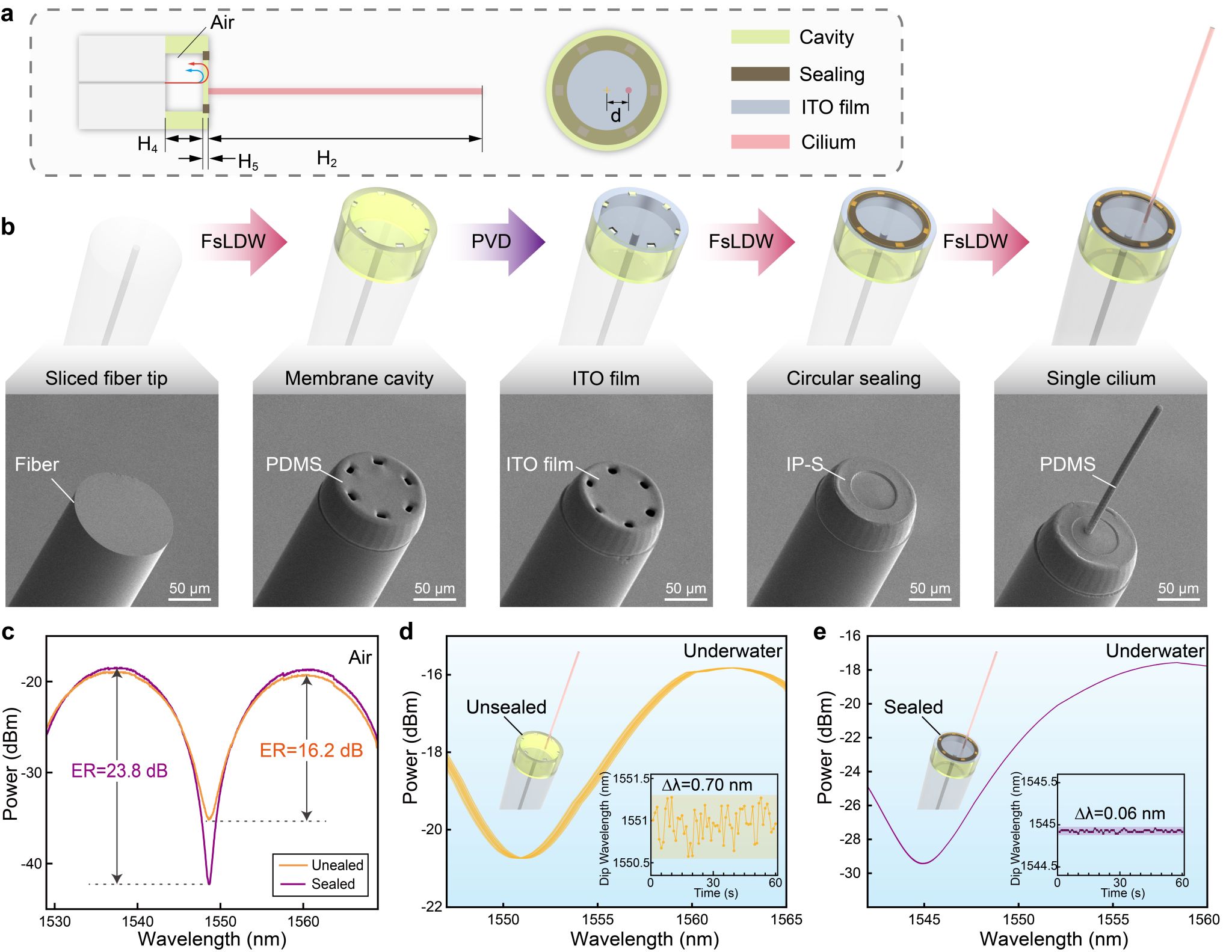 针对水下传感器环境适应性差的挑战,团队开发了基于飞秒激光直写与物理气相沉积的异质集成工艺(图2)。在光纤端面上通过双光子聚合技术精密加工PDMS柔性腔体,结合ITO薄膜,增强光学反射率和吸附性,关键技术突破在于利用IP-S光刻胶的表面张力效应实现微腔气密封装,将水下光谱漂移抑制至0.06 nm,较未密封结构稳定性提升10倍。该工艺攻克了传统水下微纳器件易渗流、易腐蚀的技术瓶颈,为水下复杂环境的应用奠定基础。