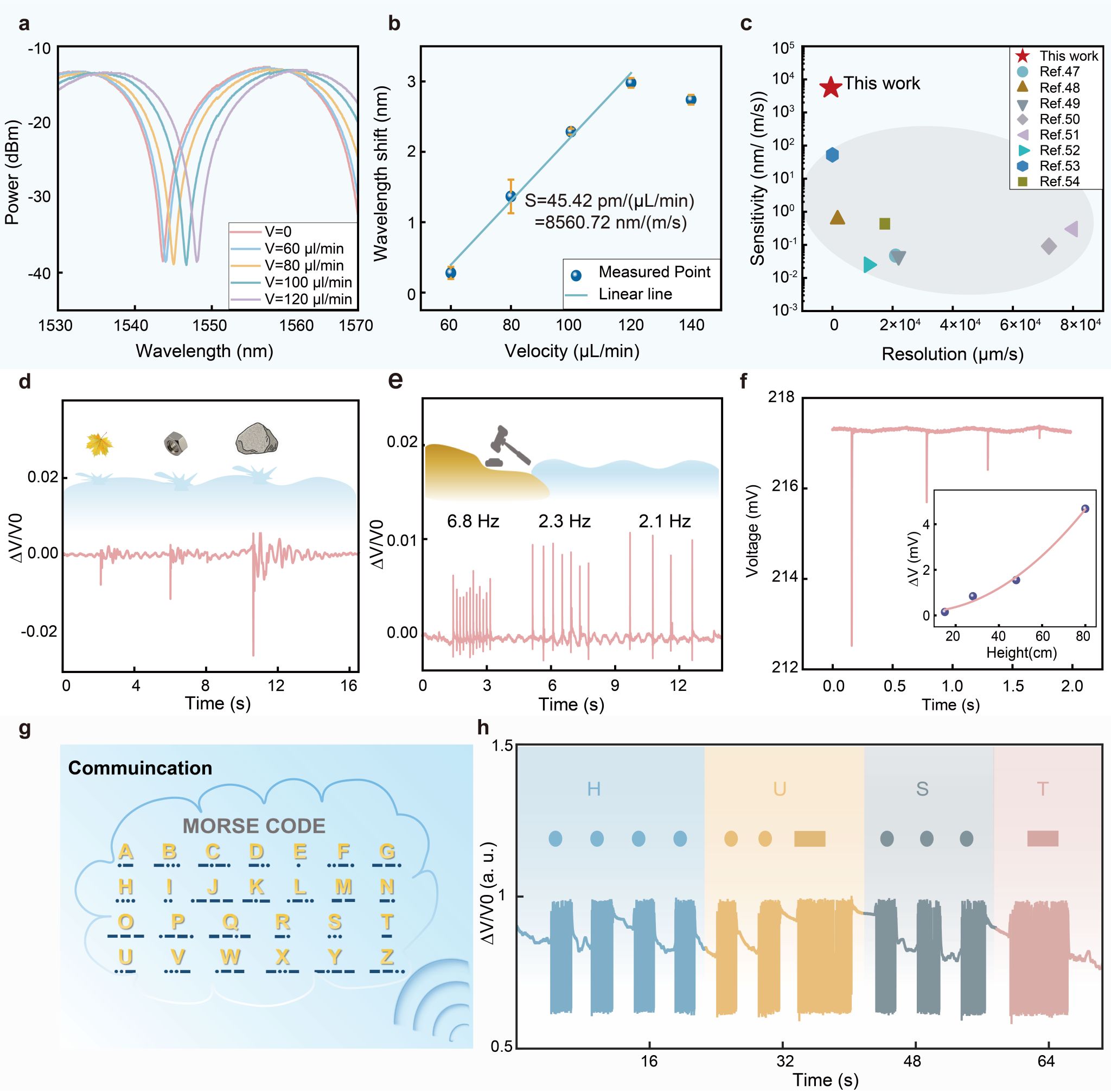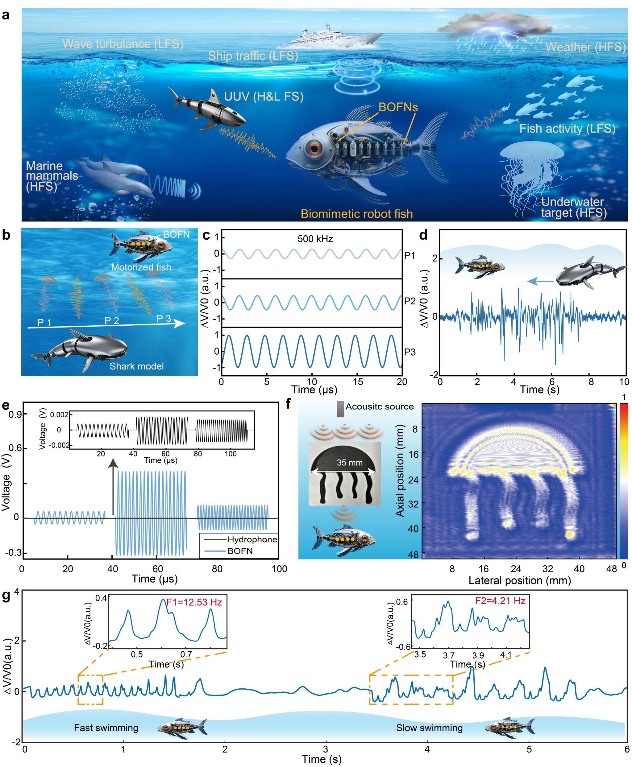 经系统测试,BOFN展现出优异的多维度探测性能。声学检测方面:IP-PDMS材质的BOFN声学灵敏度为172.24 V/kPa,能够实现0-180°全向响应,突破传统传感器方向限制;流体动力学检测方面:对微流速的灵敏度为8560.72 nm/(m/s),分辨率2.34 μm/s,可检测微弱振动(如落叶、水滴、锤击)和摩斯密码信号,实现水下通信(如传输“HUST”或“SOS”)。作为概念验证,团队将BOFN集成至机器鱼,构建了全光纤仿生鱼侧线系统。该系统可同时监测高频声学信号和低频水流扰动,其声学探测性能优于专业水听器。通过对目标(如水母、海星模型)进行逐点扫描,成功重建出清晰的目标图像。此外,BOFN还能灵敏地监测机器鱼自身游动时不同速度(快/慢摆动)的运动状态。(图3-图5)