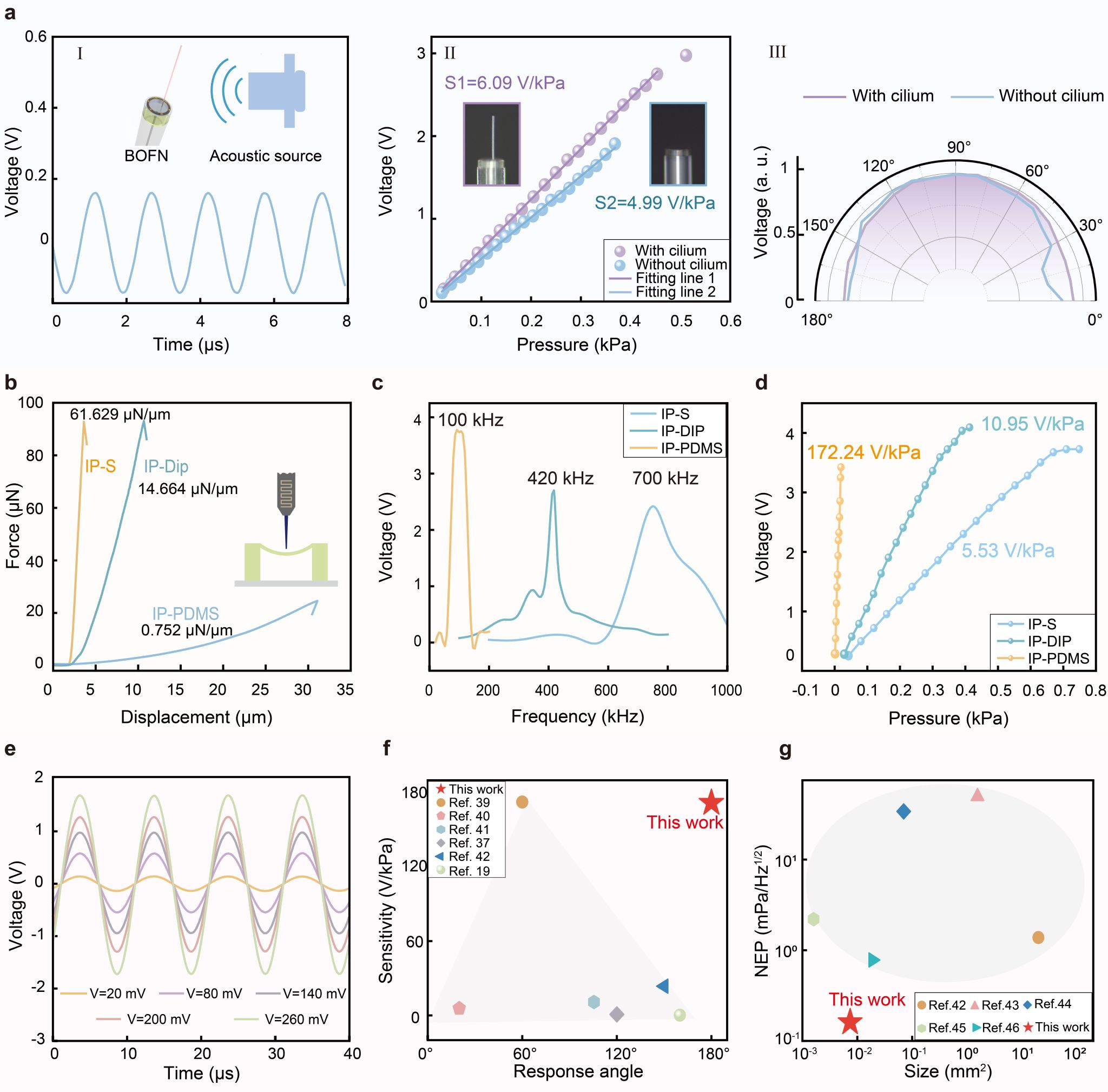 受鱼类侧线系统启发,研究团队设计了一种仿生光纤神经丘(Bioinspired Optical Fiber Neuromast, BOFN)结构,该光学仿生细胞单元包括光纤、光学支撑细胞和光学纤毛。通过3D打印光学纤毛模拟生物纤毛力学的感知功能,光纤端面法布里-珀罗(FP)干涉腔模拟支撑细胞实现机械-光学信号转换,光纤用于传递光学信号。团队创新性提出“纤毛悬臂梁挠曲-FP腔长调制”的双物理场协同增敏耦合机制,建立水下机械刺激与光学响应的定量关系,该设计在功能和尺度上模拟了鱼类神经丘的结构,实现对水下信号的高灵敏、高集成探测(图1)。